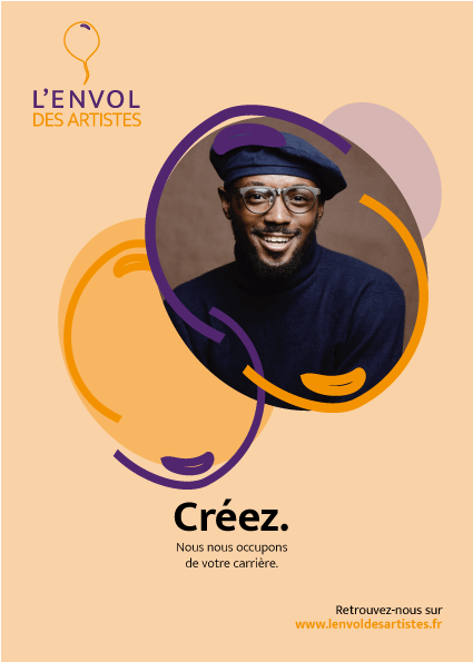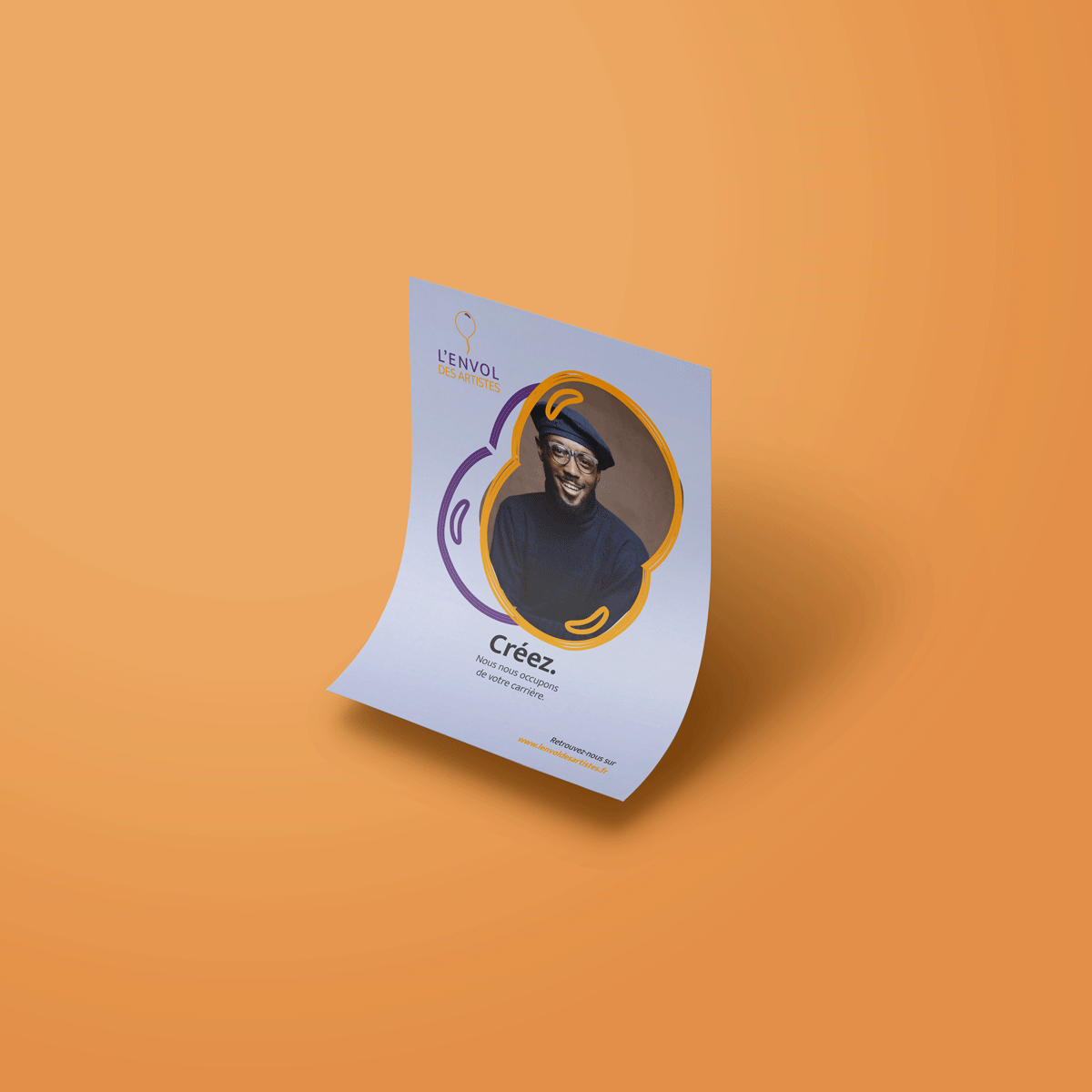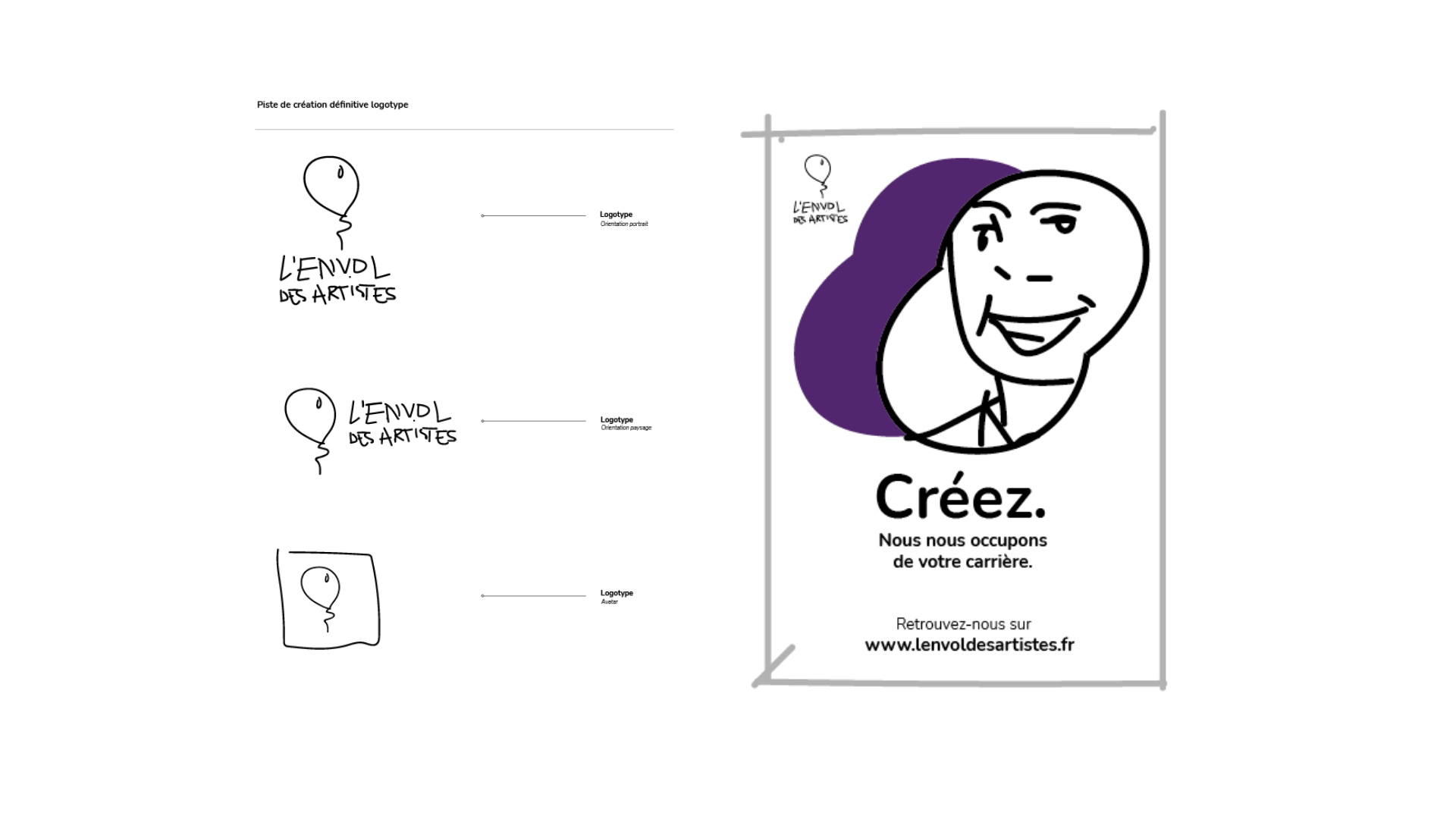 L’Envol des Artistes est une association de gestion de carrières d’artistes qui souhaitait mettre à jour son logo et créer un support print de promotion de son service (flyer) . Le travail se base sur les piges et les roughs du DA.